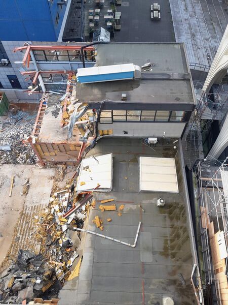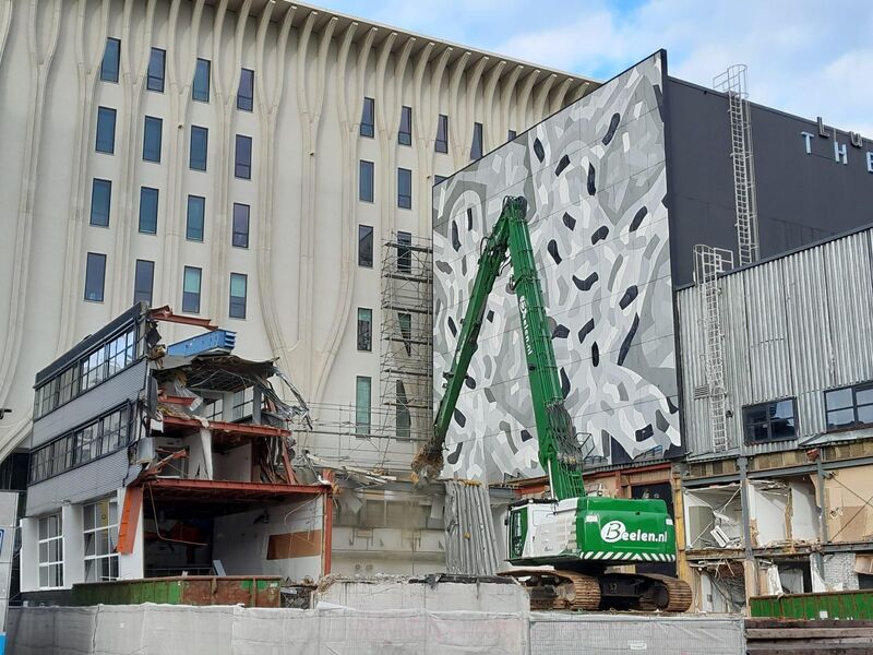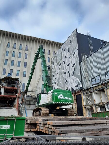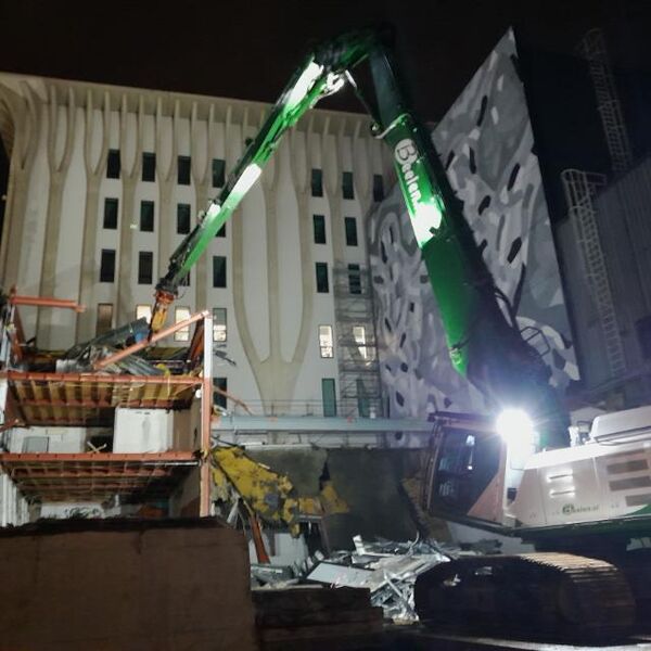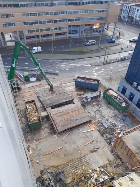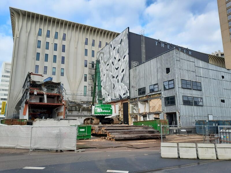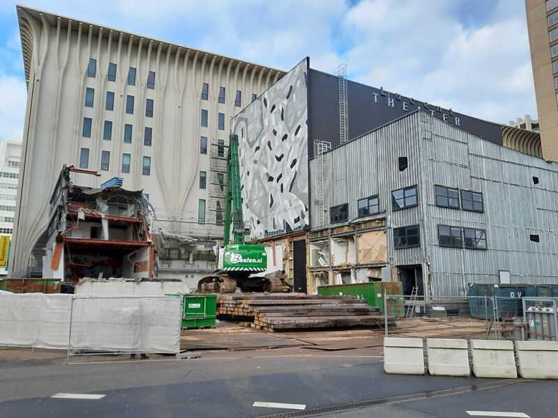 Adex Groep (voorheen Bnext.nl Sloopwerken) zorgt naast de asbestsanering ook voor de zorgvuldige ontmanteling van de bovenbouw van het theater. De kelder van het pand met aansluitende parkeergarage dient behouden te blijven. Dat geeft meteen een grote uitdaging. Voor de ontmanteling maken we daarom gebruik van de huidige constructie, die we met schotten ondersteunen. Dat maakt de werkzaamheden complex. Als steunpunten voor de machines gebruiken we de heipalen onder de constructie, omdat de vloer zelf te zwak is om de zware machines op te plaatsen, die nodig zijn voor de ontmanteling.