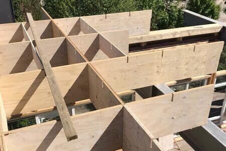 Eerst zijn de platen van de dakconstructie op maat gezaagd door mensen van Adex Groep en Level 5. Vervolgens zijn de sleuven er uit gevreesd waardoor het dak als een puzzel in elkaar valt. Uiteindelijk zijn de materialen geleverd door onze speciaal ontworpen Adex Groep container.