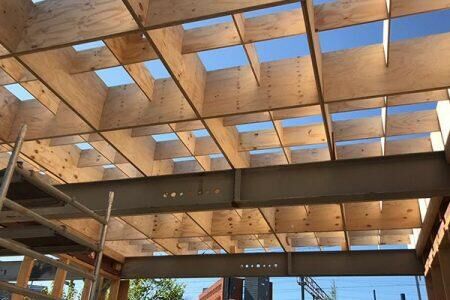 - Het dak is opgebouwd uit een inventief grid van herwonnen multiplex, dat door Adex Groep in de hub is aangepast na demontage.
