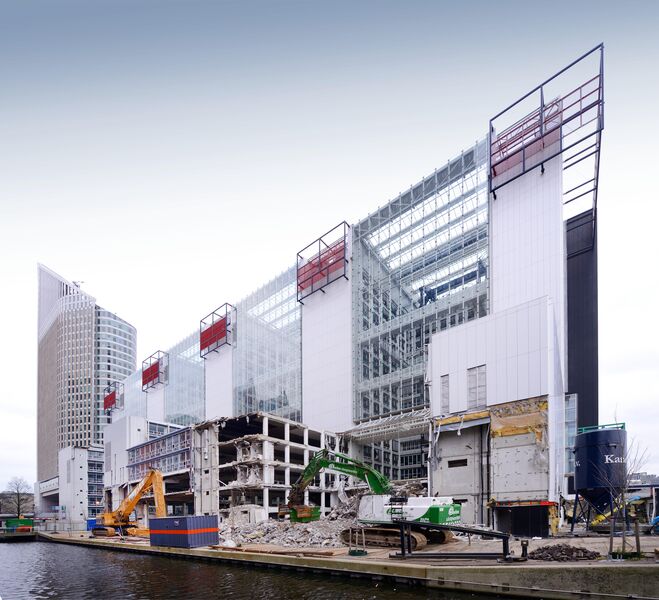 Vanwege de herinrichting van het pand moest het bestaande gebouw gestript en deels ontmanteld worden. Een speciale klus, alleen vanwege de omvang van ca 100.000 m2 BVO. Maar ook een speciale klus vanwege de ingewikkelde constructieve sloopwerkzaamheden, de beperkte omvang van de bouwplaats en omdat veel werkzaamheden gelijktijdig plaatsvonden. Het gehele pand moest inpandig gestript worden.